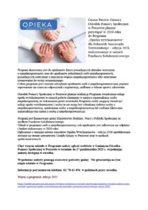 Gminny Ośrodek Pomocy Społecznej w Perzowie planuje przystąpić w 2026 roku do Programu „Opieka wytchnieniowa” dla Jednostek Samorządu Terytorialnego – edycja 2026, realizowanego w ramach Funduszu Solidarnościowego. Bez kategorii Więcej o programie, edycja 2025: https://niepelnosprawni.gov.pl/program-fs/nabor-wnioskow-w-ramach-resortowego-programu-ministra-rodziny-pracy-i-polityki-spolecznej-opieka-wytchnieniowa-dla-jednostek-samorzadu-terytorialnego-edycja-2025/ ← Previous post Next post →